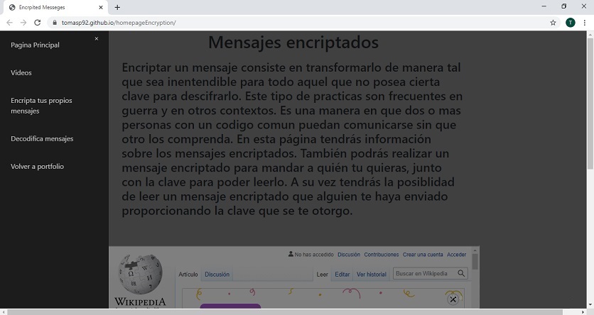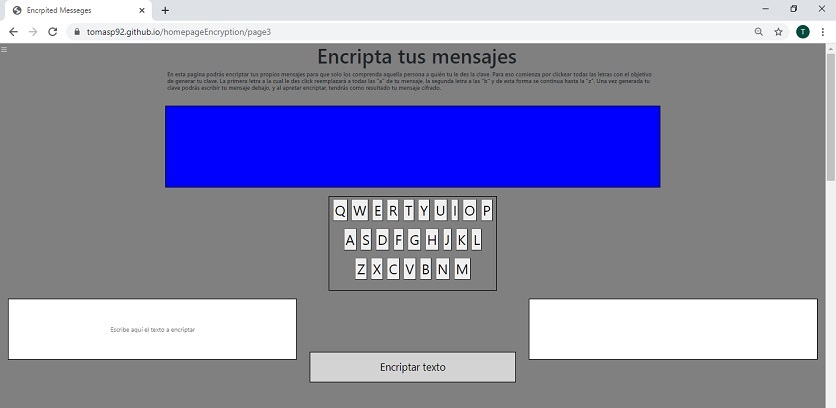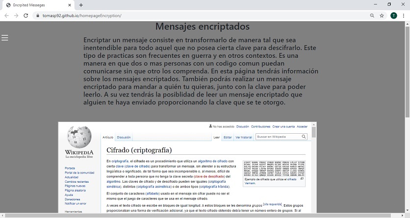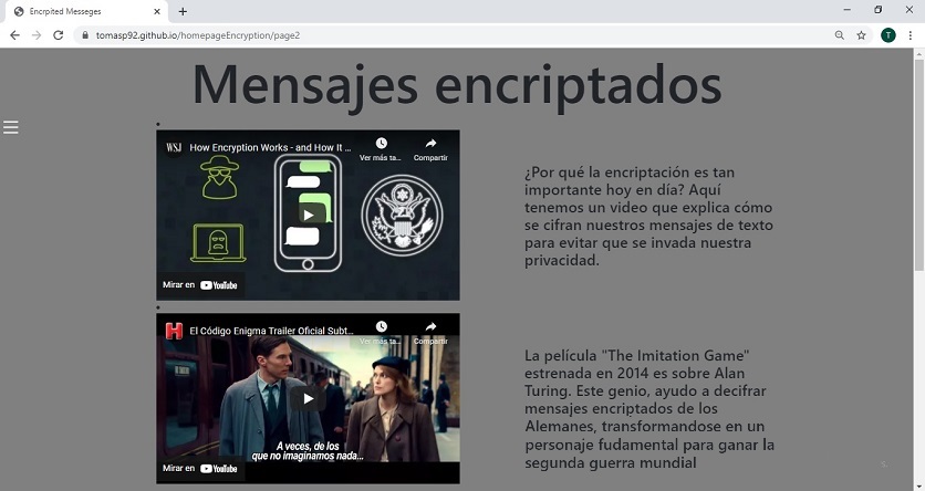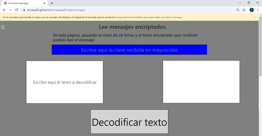 Fue realizado como trabajo final de un curso de programación en Javascript en Coder HousePagina sobre mensajes encriptados con información y con la posibilidad de encriptar tus propios mensajes.
